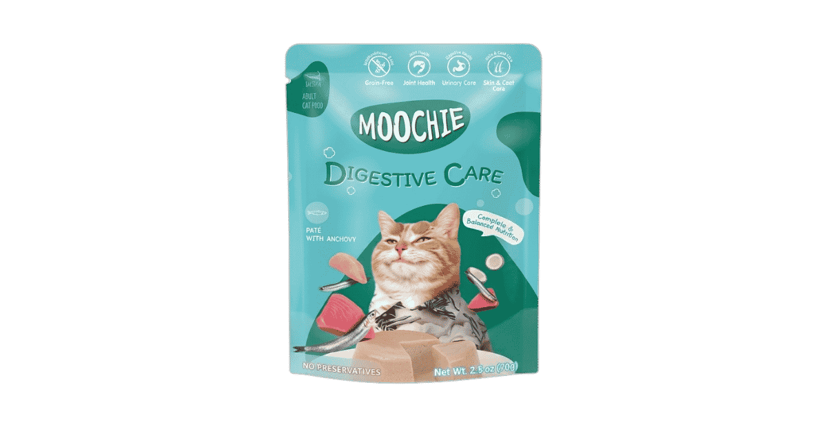 • Moochie Digestive Care สูตรปลาแองโชวี่ อาหารเปียกสูตรครบถ้วนและสมดุล (Complete & Balanced Nutrition) สำหรับแมวโต อายุ 1 ปีขึ้นไป