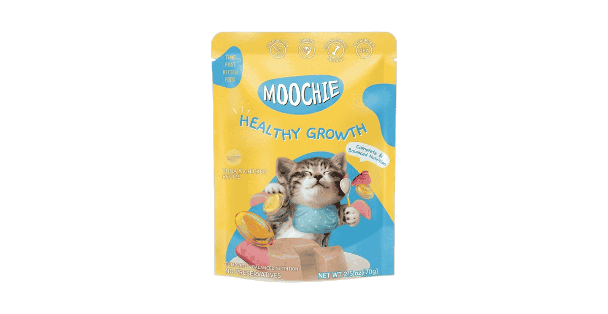 • Moochie Healthy Growth สูตรทูน่า & อกไก่ อาหารเปียกสูตรครบถ้วนและสมดุล (Complete & Balanced Nutrition) ตั้งแต่วัย 1 เดือนขึ้นไป